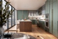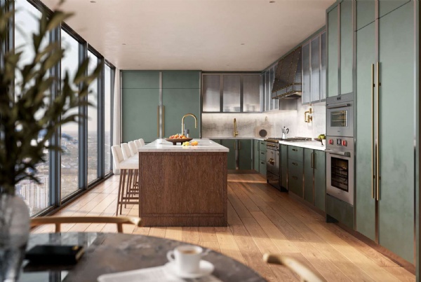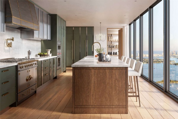 • Custom Italian cabinetry with fluted glass, wood island and the option of green or cream lacquer finish