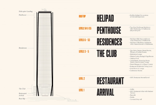 • 55 floors including 49 residential levels and three levels of private club lifestyle amenities designed by Charles & Co.