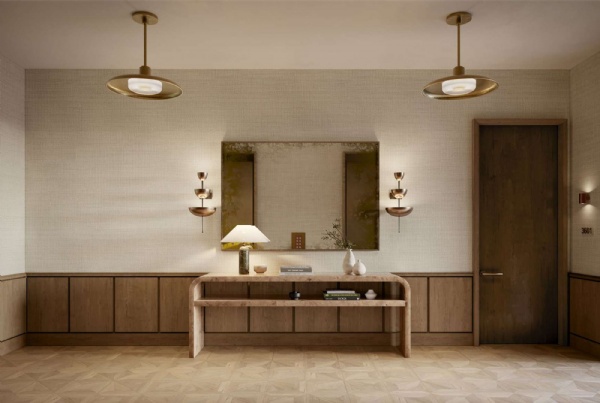 • Complementary materials menu of brass, lacquer, stainless steel, and fluted glass details and fixtures
