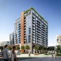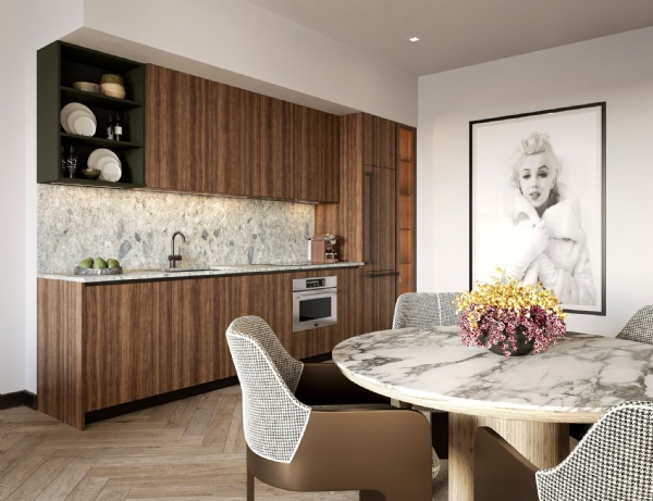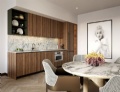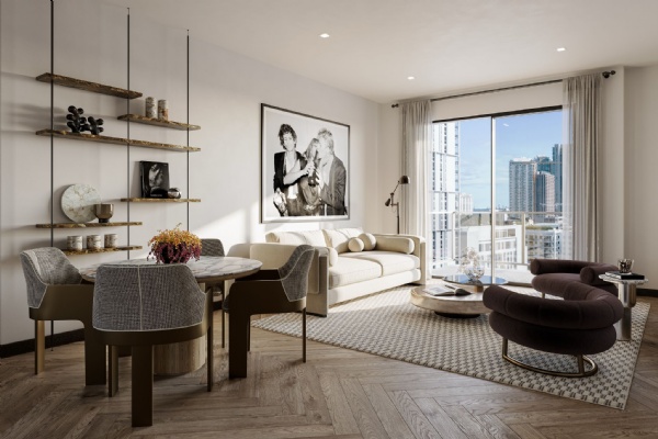Architecturally, The Rider was envisioned by Deforma Studio and features interiors by RADYCA. The building’s aesthetic draws inspiration from the retro energy of the 1970s, reinterpreted through a modern, minimalist lens. Residents and visitors will notice bold design touches, exposed materials, textured finishes, and a color palette that blends warm tones with industrial accents. The glass-fronted façade and large balconies create a feeling of openness and light, while the building’s scale maintains a boutique feel compared to the city’s towering skyscrapers. Every residence at The Rider has been carefully designed to offer functional luxury—combining high design with comfortable living. Open-concept floor plans, floor-to-ceiling windows, and private terraces are complemented by elegant interior finishes. Kitchens feature premium European cabinetry, stone or Cosentino countertops, and high-end appliances from Bertazzoni. Bathrooms are spa-inspired, with rainfall showers, designer fixtures, and natural materials that reinforce the building’s sophisticated yet relaxed atmosphere. Smart home technology, keyless entry systems, in-unit washer and dryers, and pre-wiring for high-speed internet ensure that every residence meets the needs of today’s modern buyer.