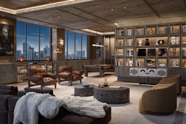 One of the development’s defining characteristics is its emphasis on lifestyle and amenities. The Rider’s amenity package is extensive, curated to deliver a mix of relaxation, wellness, and entertainment. The rooftop level features a resort-style pool deck surrounded by lounge seating and tropical landscaping, offering unobstructed views of the Miami skyline. Adjacent to the pool, residents can enjoy a rooftop bar and lounge area designed for social gatherings. Wellness facilities include a state-of-the-art fitness center equipped with Peloton and Technogym equipment, infrared saunas, a cold plunge garden, a Turkish hammam, and a full-service spa offering treatments such as massages and IV therapy. Beyond physical wellness, the building also caters to creativity and community with unique amenities such as a vinyl listening room with DJ turntables, a speakeasy-style restaurant and bar, an art gallery, and a lobby café. Even pets have their own dedicated space, with a pet spa and grooming station located on-site. For urban mobility, residents have access to “The Toybox,” an exclusive collection of motorcycles, Vespas, and electric bikes available for personal use.